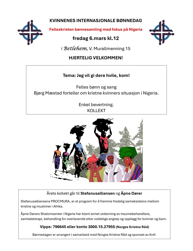 Kvinnenes internasjonale bønnedag 15. februar 2026 Del denne siden med andre! Ditt navn: Din epost: Mottakers navn: Mottakers epost: Klarte ikke å laste inn Facebook-feeden.Klikk her for å gå til Facebook-siden vår!